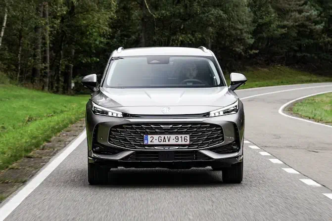 Qua design is er geen enkel verschil te zien tussen de MG HS op benzine en deze Hybrid+. Of toch: een badge op de kofferklep. Maar een laadpoort ontbreekt, want deze hybride laadt op tijdens het rijden. Deze tweede generatie HS had nog geen facelift nodig, want hij is pas sinds eind 2024 uit. Met zijn lengte van 4,655 m, breedte van 1,89 m en hoogte van 1,664 m is het geen kleine auto. Daarmee heeft hij ongeveer hetzelfde formaat als de Toyota RAV4, Opel Grandland en de Dacia Bigster.