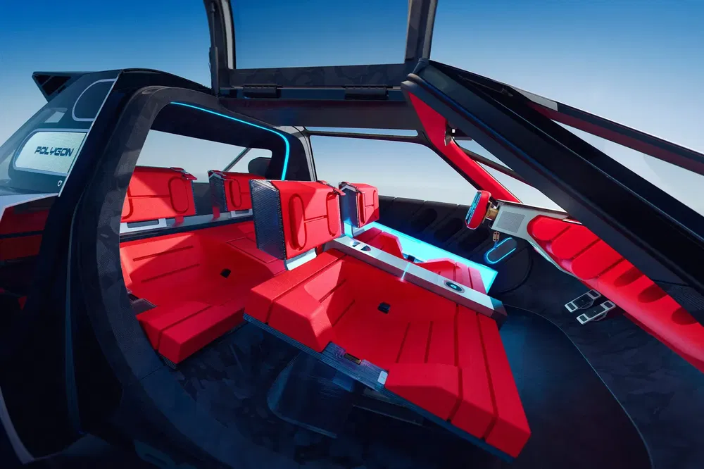 Die LEDs zijn trouwens ook bijzonder: het zijn Micro-LEDs, een technologie die het toelaat om zowel mooie animaties als een heel fel licht te combineren. Die Micro-LED-technologie zit niet enkel in de koplampen en achterlichten, maar ook op de C-stijl om de laadstatus aan te geven. Maar de Micro-LEDs zitten niet enkel aan de buitenkant. De Peugeot Polygon Concept debuteert namelijk de nieuwe generatie i-Cockpit van het Franse merk. Een dashboard dat niet langer gebruik maakt van traditionele displays, maar wel van één groot head-up display. Een Micro-LED-paneel achter het stuur projecteert alle informatie op de voorruit met het equivalent van een 31-inch scherm. De bestuurder moet ook de informatie kunnen personaliseren, maar hoe, dat geeft Peugeot niet meteen mee.